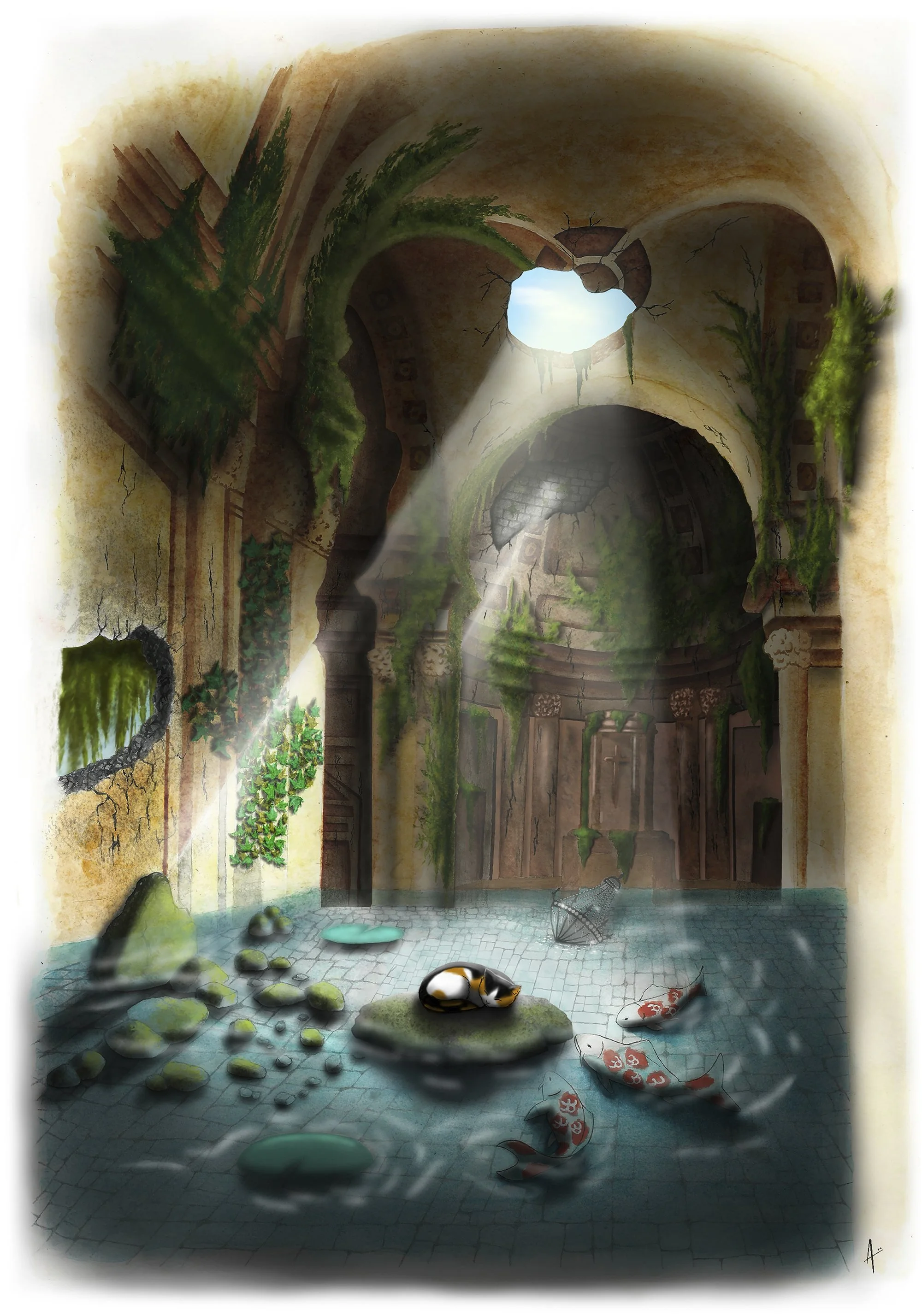 On y découvre l'Église Sainte-Croix de Carouge en ruine, sombre et silencieuse, vidée de toute présence humaine. La nature y a repris ses droits. Un petit chat y trouve refuge, tandis que la pluie et le temps ont formé un bassin d’eau où apparaissent des poissons, surpris de croiser un prédateur encore en vie.