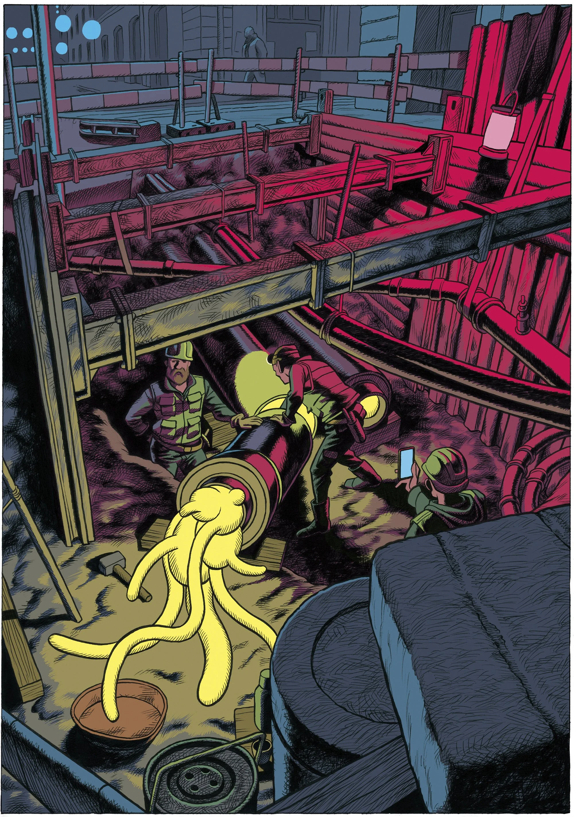 Octobre 2025, une petite équipe ouvre la chaussée, à l’angle de la rue Vautier et de la rue des Moraines, afin de rénover des canalisations, et découvre l’existence d’un organisme biotechnologique inconnu se propageant dans tout le sous-sol de la ville de Carouge. L’évènement est tenu secret et la chaussée soigneusement refermée.